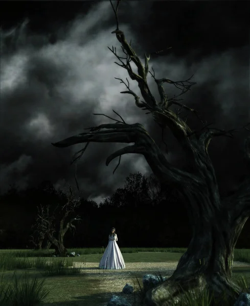 Dipenuhi ketakutan, pengawal itu segera membalikkan arah, namun suara langkah wanita tersebut sewmakin mendekat di belakangnya. Ia memacu kudanya secepat mungkin, tetapisaat menoleh, sosok bergaun putih itu ternyata duduk dibelakangnya, membisikkan sesuatu di telinganya: